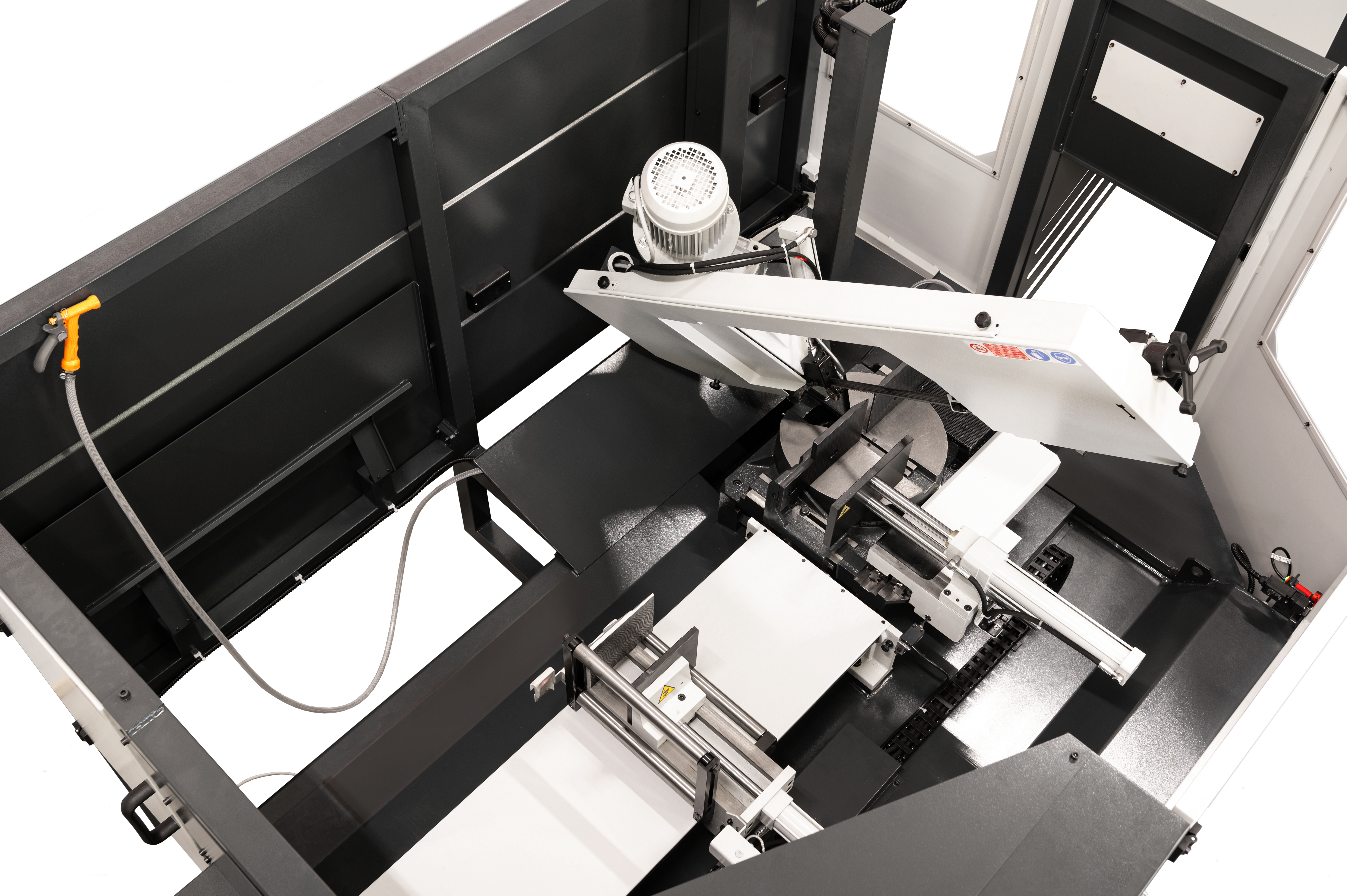 Przecinarka wyposażona jest w 10-calowy panel dotykowy, który umożliwia w pełni automatyczne zarządzanie cyklem pracy. Funkcja optymalizacji cięcia prętów minimalizuje odpady materiałowe i skraca czas produkcji. Posuw materiału realizowany jest przez wózek napędzany śrubą kulową z recyrkulacją, sterowaną silnikiem bezszczotkowym, co gwarantuje precyzyjne pozycjonowanie bez ograniczeń długości.