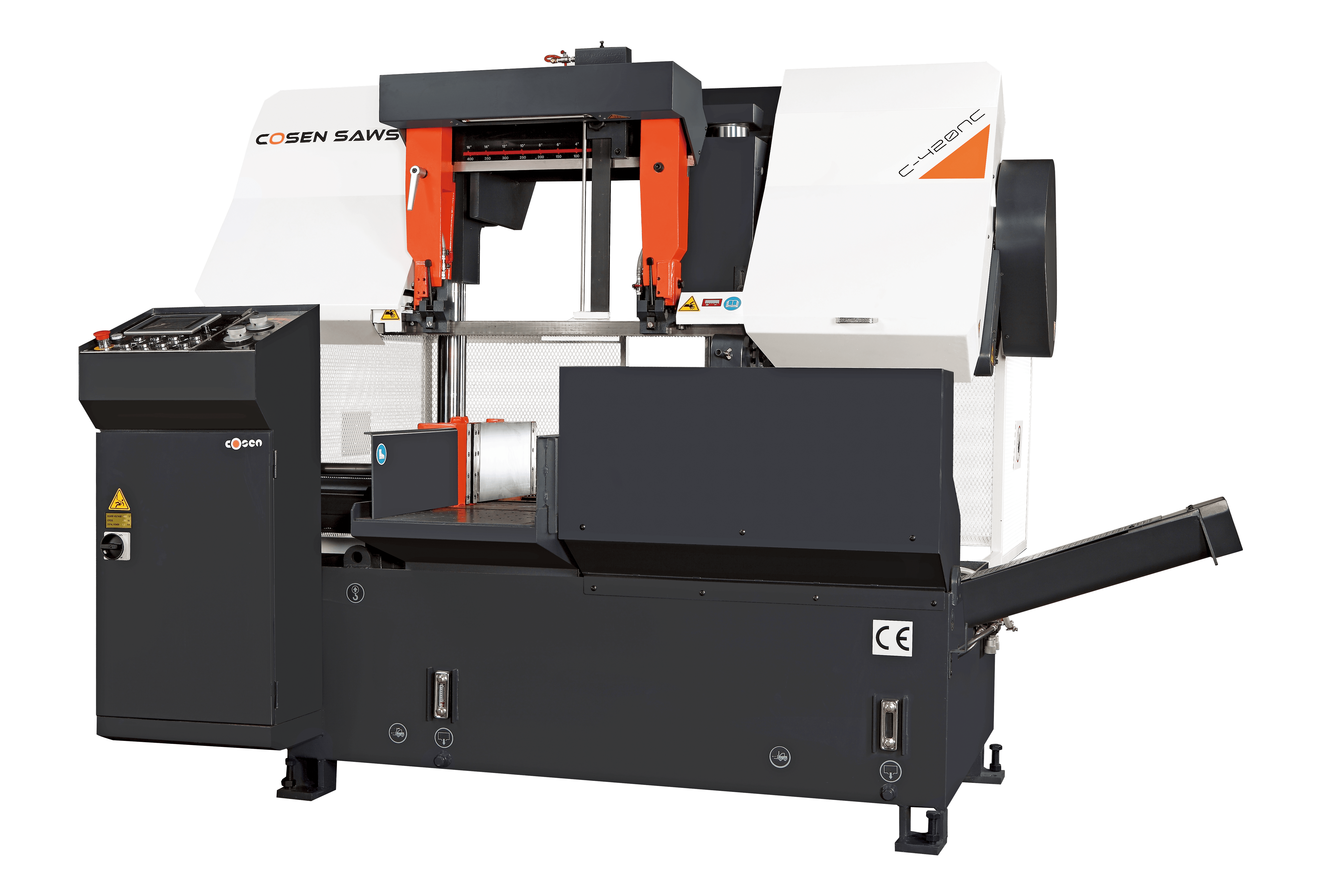 Przecinarka taśmowa Cosen C-420 NC jest wyposażona w mocny 5,6 kW silnik napędowy taśmy tnącej, niezależny panel sterujący, taśmę tnącą o szerokości 41 mm, oraz wytrzymałą dwukolumnową konstrukcję. Powyższe cechy tworzą z niej sztywną, stabilną oraz bardzo wydajną maszynę. Precyzyjne, ponadwymiarowe kolumny umożliwiają równe przesuwanie się ramy oraz stabilny nacisk podczas całego cyklu cięcia, co pozwala zwiększyć wydajność cięcia i wydłużyć żywotność taśmy tnącej.