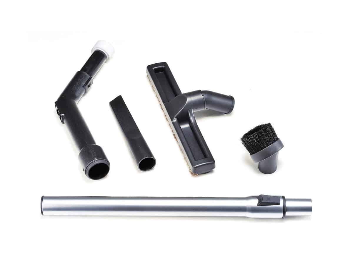 Zestaw zawiera: uchwyt ssący, dyszę szczelinową, dyszę podłogową, okrągłą dyszę szczotkową, chromowaną rurę teleskopową.